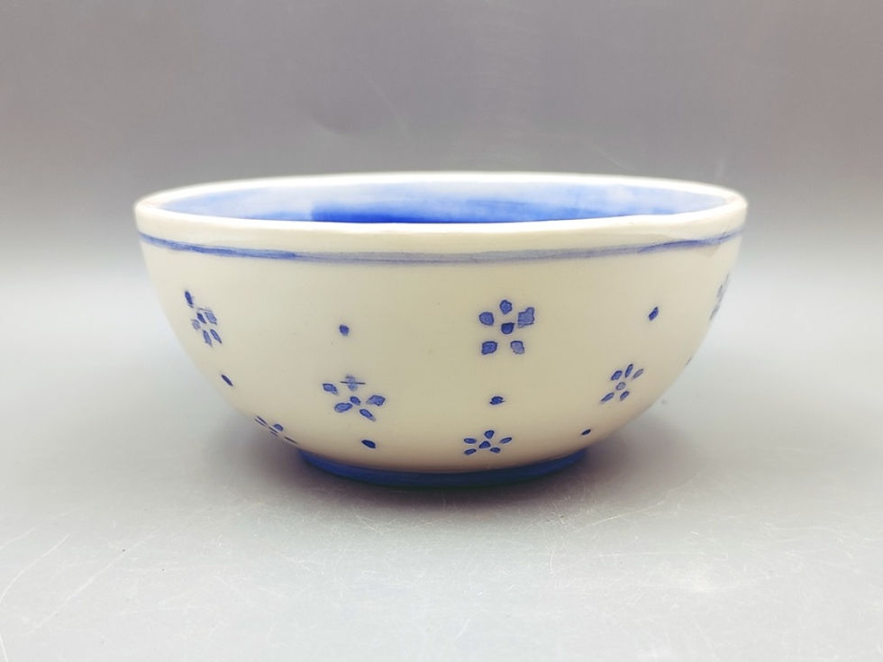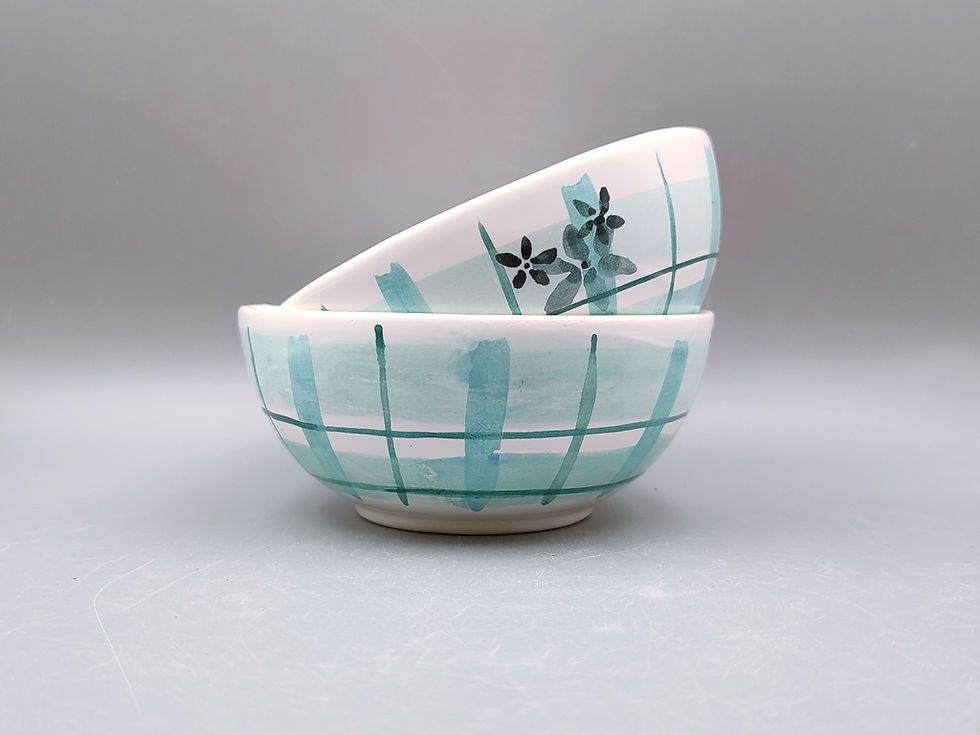 Les bols sont des biscuits de faïence blanche de fabrication française, tournés à Vallauris ou coulés à l'atelier.